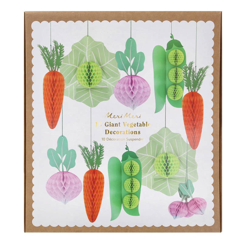 - A set of 10 giant paper vegetable decorations with tissue paper honeycomb details
